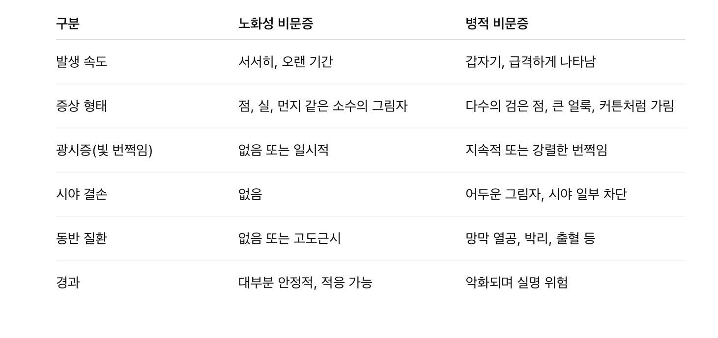 대부분은 노화로 인한 생리적 비문증이지만, 일부는 망막 열공·박리 등 위험한 병적 비문증일 수 있어정확히 구분하는 것이 중요합니다.