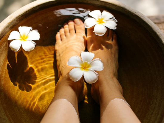 미지근한 물에 발을 담가 각질을 부드럽게 만듭니다.